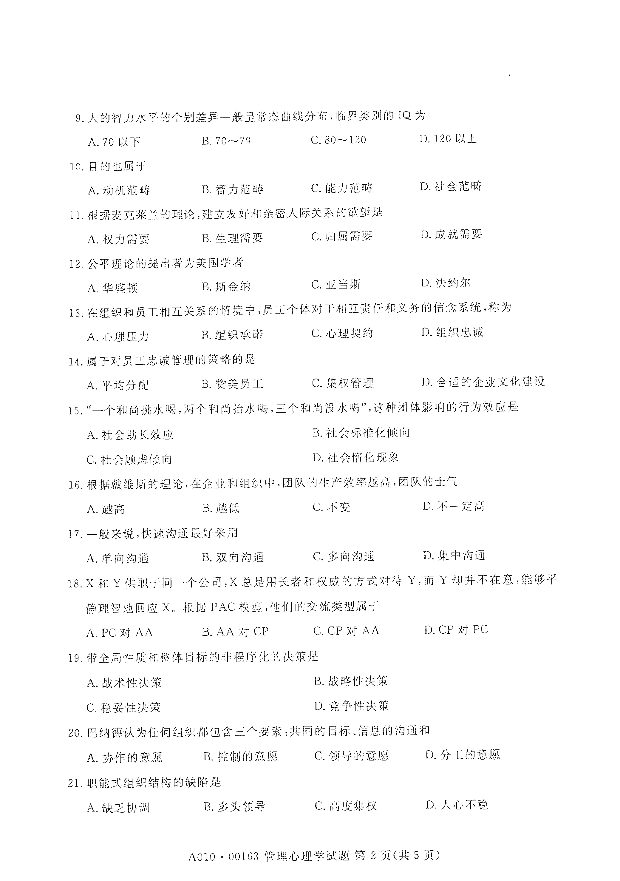 2021年4月湖南自考管理心理学(00163)真题试卷